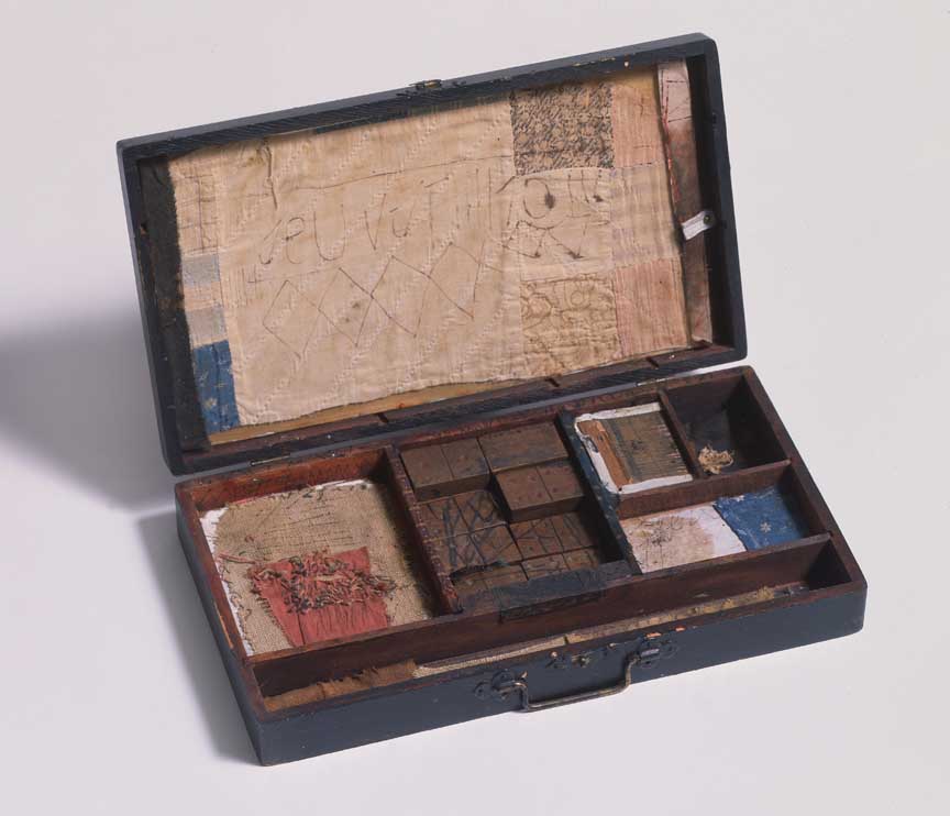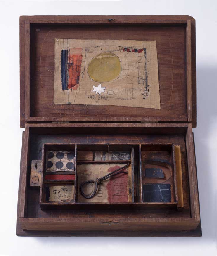 Standing in the gallery, I knew. Something dark had informed this artist at an early age. Her intimate assemblages and collages invited me into a world both familiar and foreboding. Scraps of fabric conjured up the small cotton prints and textures of Auntie Em’s aprons. Twine and wire connected dollhouse-sized panels whose abstract scenes, inhabited by childlike figures, symbols, and letters, were etched as if with barbed wire. Worn chunks of wood, easily held in one’s hand, fit into claustrophobic cases like ambiguous puzzles.