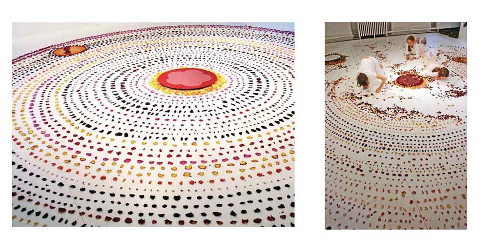 Sharon Watts: You’ve been a working artist for almost forty years, doing everything from printmaking to portraits on rose petals to participatory public art projects. How did the rose petal mandala become part of your creative oeuvre?