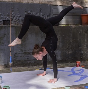 When is a handstand not just a handstand? The answer, in this case, is when Robin Ann Meyer literally turns this challenging pose into performance art. At the same time Robin Ann manages yet another creative feat, by holding a paintbrush in her toes, dipping into pigment, and applying it painstakingly to a canvas. The performance–and the results–are quite astonishing!